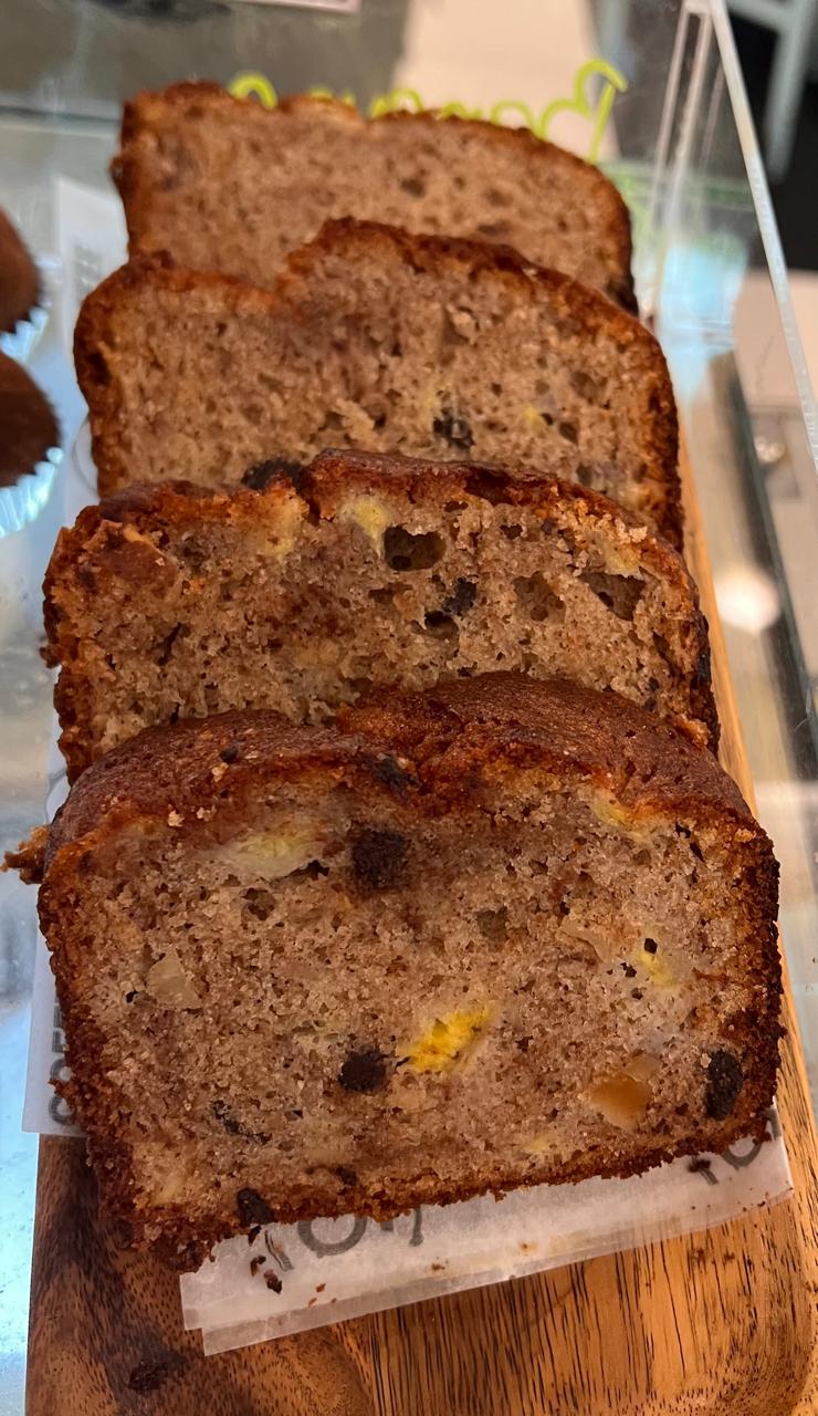 Bolo de banana com extrato de baunilha natural, Iogurte, Canela, chip de chocolate 70%, as vezes contendo castanha do pará.